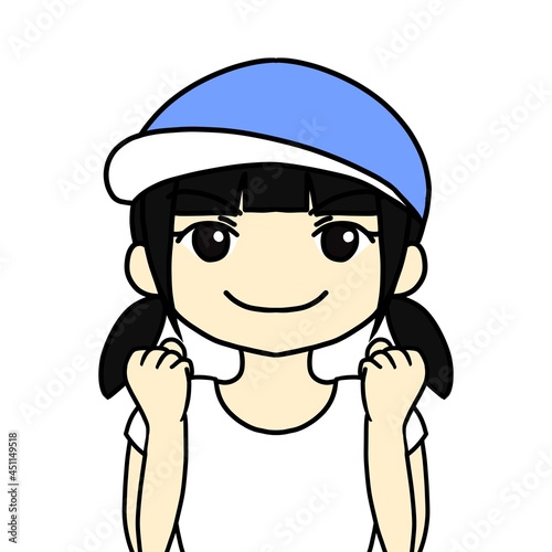 青色の帽子をかぶっている2つ結びの女の子