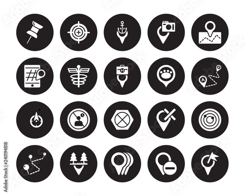 20 vector icon set : Push pin, Marked Place, Minus Location, Motion, National Park Pin, Placeholder, Pet Zone Point, No gps, waiting, Pharmacy, Port isolated on black background