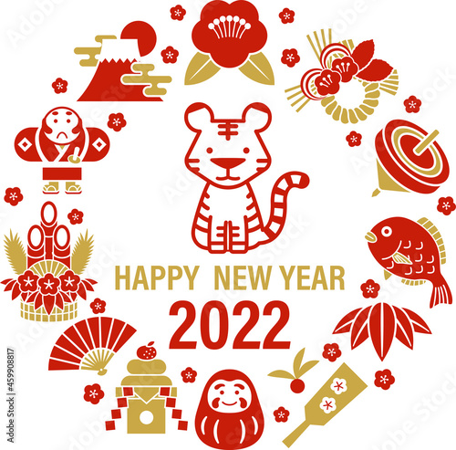 new year, new year's day, camelia, tiger, tiger, kite, fuji, kadomatsu, torii, shrine, sea bream, fan, fan, rice-cakes, decoration, piece, battledore, background, flower, pattern, pattern, winter, sum, sweet, icon, vector, material, illustration, red, gold