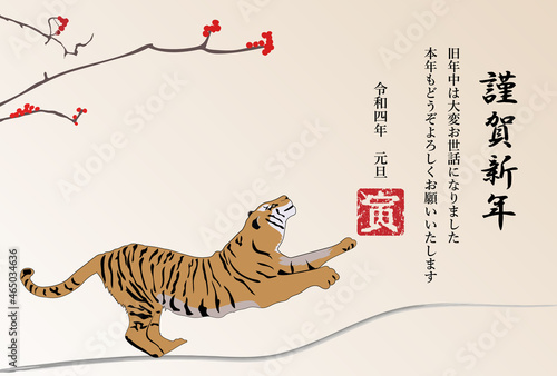 2022干支の虎と梅の木の年賀状背景素材。寅、はがきサイズ比、ハンコ、ベクターイラスト