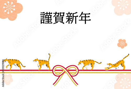 2022年の和風年賀状、寅年、水引の上を歩く4匹の虎と梅の花