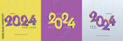 2024 new year greetings with 3D hanging number on modern colour. Happy new year 2024 celebration template