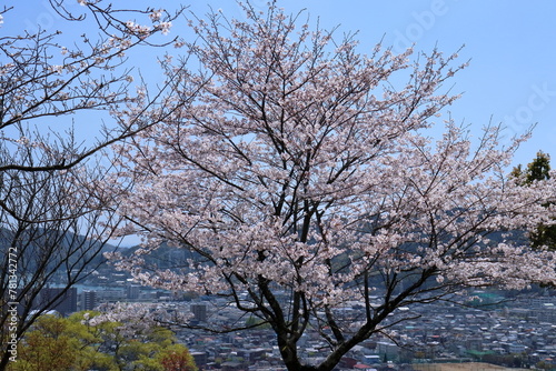 cherry blossom, cherry tree, town, town, watch, flower, shikoku, spring, landscape, landscape, view, view, sakura, climb, hike, mountain, nature, leisure, refresh, rest, copy space, background, sunny, tour tourism, travel, japan