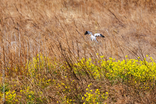 狩りのために菜の花畑を飛翔する美しいハイイロチュウヒ(タカ科)。 日本国群馬県、利根川河川敷にて。 2024年3月24日撮影。 A beautiful Northern harrier (Circus cyaneus, family comprising hawks) flies over a field of rape blossoms for hunting. At Tonegawa r