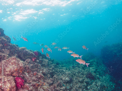 美しいホウライヒメジ(ヒメジ科)の他群れ。 日本国静岡県伊豆半島賀茂郡南伊豆町中木から渡し船で渡るヒリゾ浜-2024年6月 A school of the Beautiful Whitesaddle goatfish (Parupeneus ciliatus) and others.