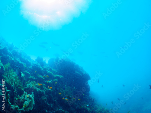 ウミカラマツ(ソフトコーラル)が生えるドロップオフに集まる、キンギョハナダイ(ハナダイ亜科)、キホシスズメダイ(スズメダイ科)、タカサゴ(タカサゴ科)他の群れ。 南伊豆町中木から渡し船で渡るヒリゾ浜-2024年7月 Sea Goldie (Pseudanthias squamipinnis) Heavenly Damselfish (Pomacentrus coelestis)