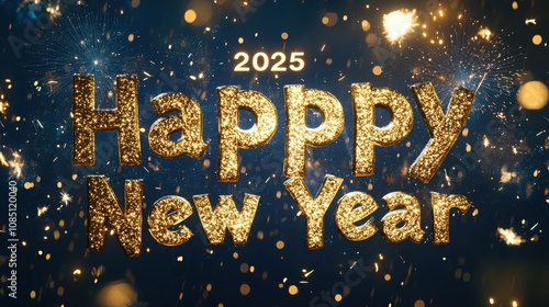 "2025 Happy New Year" in gold glittery font on a deep midnight blue background with fireworks.