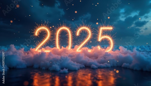 2025 New Year fireworks display. Sparkling numbers on clouds. Night sky celebration. Festive holiday event. Bright winter illumination. Happy New Year card. Number symbol. Time-lapse photography.