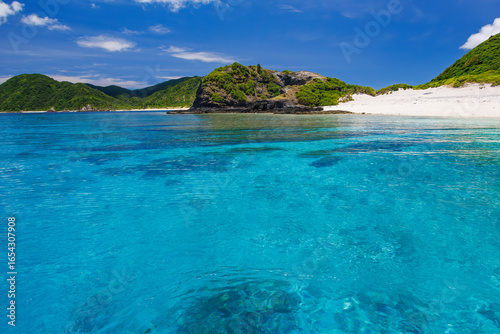 無人島の嘉比島が見える。 白砂のビーチには観光客が上陸している。 パラソルやボート、サバニ(沖縄特有の双胴船)も見える。 船上からも水底の様子が見える。 素晴らしい透明度。 沖縄県島尻郡慶良間諸島座間味島嘉比島-2025/6/27