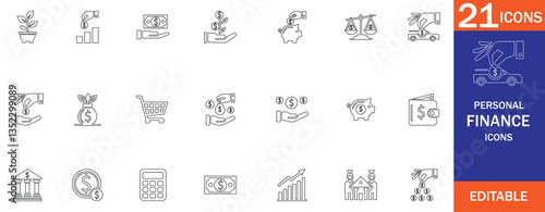 21 editable line icons for personal finance, featuring money, savings, investment, banking, budgeting, and financial growth. Ideal for business, fintech, and marketing use