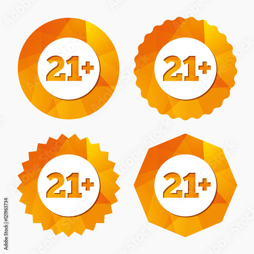 21, adult, content, only, age, limit, 20, year, 1, plus, icon, signs, buttons, symbol, flat, label, mark, token, shape, creative, quality, stamp, concept, vector, badge, seal, art, graphic, illustration, geometric, app, circle, triangular, low, round, star, orange