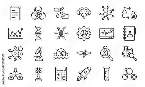 24 Science and Laboratory Line Icons DNA, Chemistry, Biology, Physics, Research, Experiment, and Medical Vector Icon Set for Scientists, Teachers, and STEM Projects
