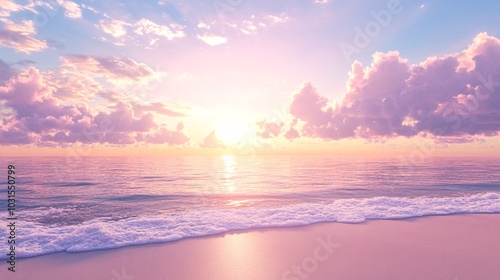 2408 107.A serene morning beach scene with a cotton candy sunrise, where the sky is filled with fluffy pink and lavender clouds. The sun rises gently above the horizon, casting a soft glow over the