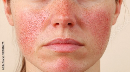 2410 12.Close-up of a woman suffering from rosacea, showing large red patches on her cheeks, the inflammation clearly visible. The neutral beige background brings focus to the skin irritation, with