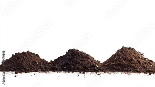 2410_006.three piles of rich brown soil, varying sizes, isolated on white background, high-contrast photography, detailed soil texture, organic matter visible