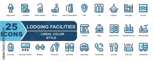 25 accommodation facility icons.lineal color style.modern style icon.contains bunk bed,extra pillow,coffee machine,ring,order,restaurant,food menu,swimming pool,spinning bike,gym,suitcase.