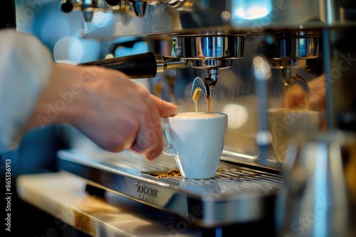 hand, making, cappuccino, high, detail, photorealistic, focused, action, hot drink, shop