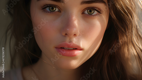 25 year old woman with radiant and fresh skin, photo shoot, beauty model, light background, close-up of face