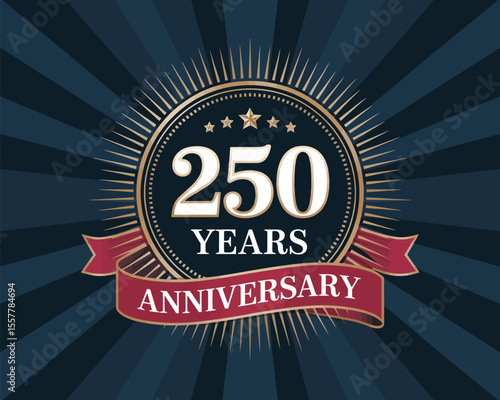 250 years anniversary celebration emblem with golden stars, red ribbon, and radiant background for historic milestone or company branding