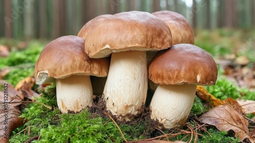 2.A cluster of boletus mushrooms with large, smooth brown caps and thick white stems sprouting from a vibrant green moss-covered forest floor. Surrounding them are fallen leaves, twigs, and patches