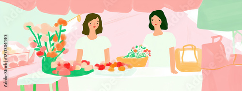 2D Illustration of Fresh fruit market scene with two women selling colorful produce. vibrant atmosphere showcases variety of fruits and flowers, creating cheerful and inviting environment
