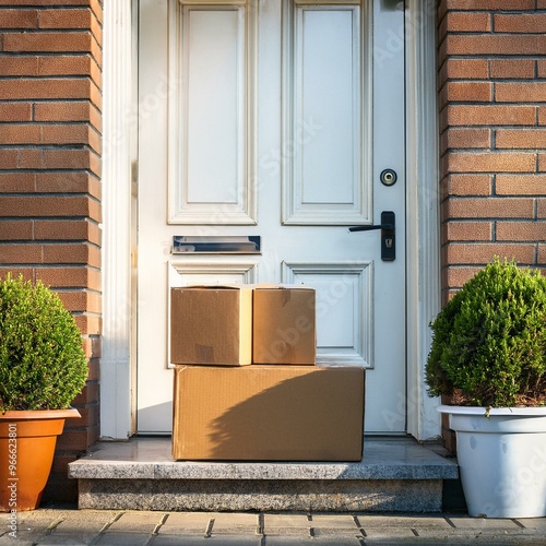 3 gros colis posés devant une porte d'entrée blanche en image ia