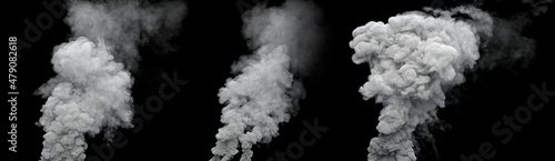 3 white toxic smoke columns from coal power plant on black, isolated - industrial 3D illustration