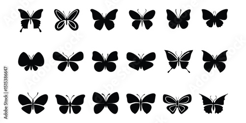 30 Black Butterfly Vector Silhouettes – Flat Icons of Butterflies Flying, Resting, and in Motion from Multiple Camera Angles for Nature and Decorative Design
