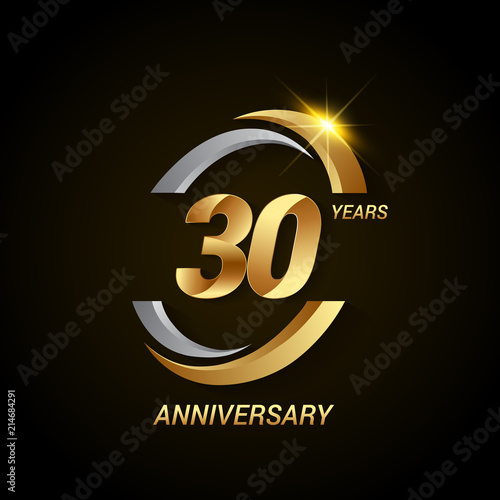 30 Years Anniversary Celebration Logotype. Golden Elegant Vector Illustration with Swoosh, Isolated on Black Background can be use for Celebration, Invitation, and Greeting card