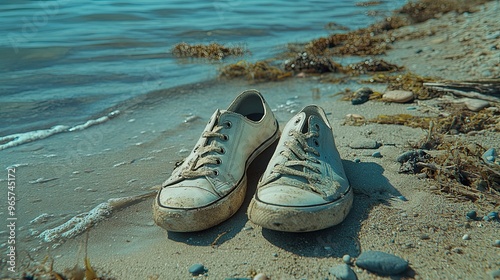 34. A pair of shoes left behind on a deserted beach, departure, abandoned path in life