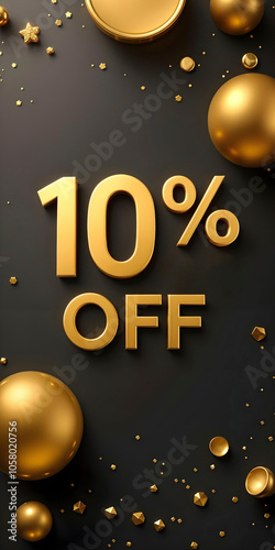 3d 10% off golden black banner. Sale. Golden inscription. Discount