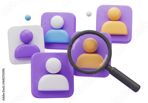 透明な背景に人材探索を表す虫眼鏡と人物アイコンの3Dレンダリングイラストレーション
