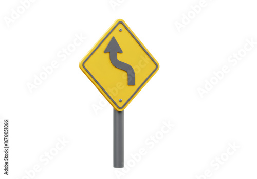 注意喚起のための黄色の曲がりくねった道路標識アイコンと透明な背景の3Dレンダリング