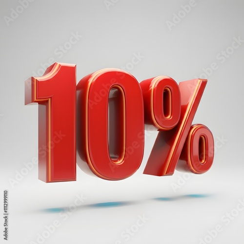 3D bold red text reading '10%' with a glossy finish and floating shadow effect, highlighted by rim lighting. Presented on a pure white background, offering a sleek and professional promotional design