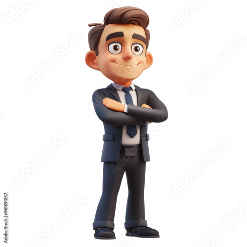 three-dimensional, cartoon, businessman, standing, arm, crossed, suit, attaching, business, pose, office, character, design, digital, illustration, graphic, white, background, mascot, professional, confident, photogenic, corporate, male, guy, person, man, professionalism, leadership, confidence, attitude, entrepreneur, manager, executive, success, cartoony