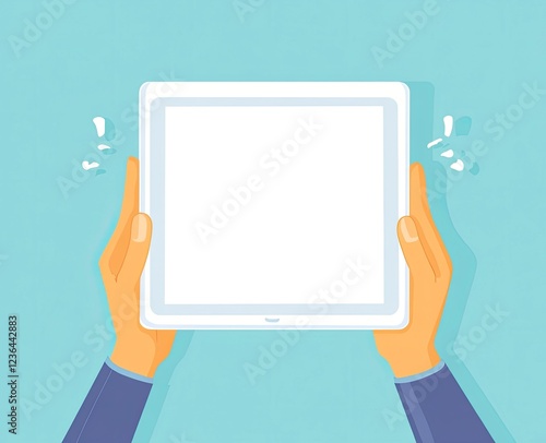 3D cartoon rendering of hands holding a blank tablet screen, against a blue background. Vector illustration with a simple design,