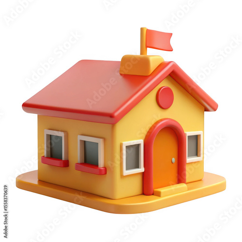 three-dimensional, school, building, cartoon, education, house, flag, architecture, children, illustration, isolated, on, transparent, background, realistic, render, clean, design, yellow, red, minimalist, icon, asset, graphic, element, stock, image, commercial, use, object, digital, art