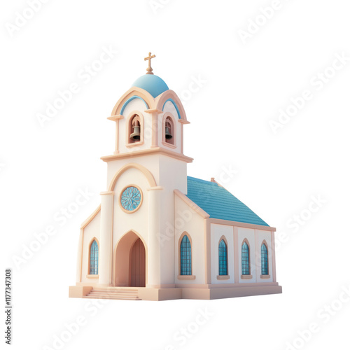 3D church building with bell tower and arched windows, soft pastel colors. Suitable for concepts related to religion, community, or classic architecture. Isolated on transparent background, png.