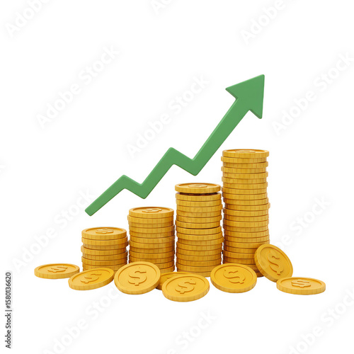 growth, coin, arrow, success, finance, money, investment, increase, profit, business, economy, wealth, currency, graph, chart, statistic, market, financial, banking, cash, diagram, concept, rising, gold, stack, heap, fund, return, gain, revenue, income, capital, asset, value, trade, commerce, exchange, pay, savings, budget, lender, loan, illustration, transparent, background, isolated, three-dimensional, rendering, digital