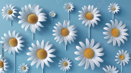 three-dimensional, daisy, flower, collection, different, size, angle, isolate, blue, background, motif, product, colours, bundle, inspire, graphic, modern, floral, poster, creative, structure, detail, render, design, vibrant, quality, object, decor, simulate, creation, concept, high-coloured, artistic, model, sculpture, element, special, artwork, arrangement