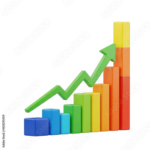 three-dimensional, growth, chart, financial, graph, bar, upward, arrow, business, success, economic, trend, datum, visualisation, positive, progress, investment, stock, market, statistic, profit, revenue, planning, strategy, sale, report, abstract, concept, icon, illustration, digital, art, render, realistic, colourful, isolated, high, resolution, commercial, use, imagery, clean, design, modern