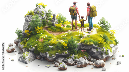 3D Flat Icons: Father Leading Family on Hiking Adventure, Exploring Nature Trails in Isometric Scene