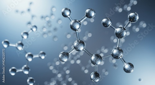 3D glass molecular model floating on silver-blue background symbolizing futuristic science, structural biology and biochemistry