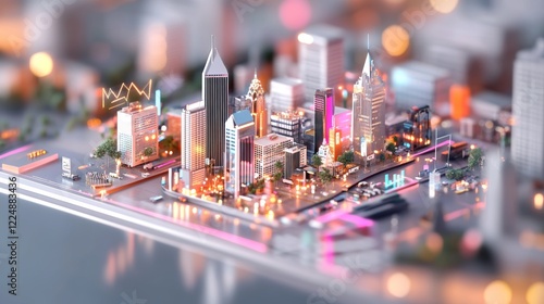 3D Graph Icon with Arrow Representing Business and Finance in a Cityscape
