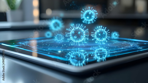 tablet, holographic, virus, firewall, glowing, digital, workspace, technology, copy space, protection, icon, hologram, modern, futuristic, laptop, computer, security