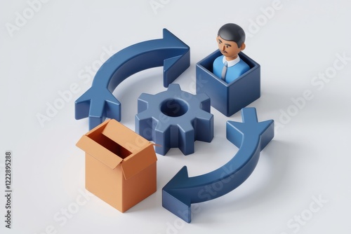 workflow, process, business, three-dimensional, illustration, gear, cog, box, package, arrow, cycle, circular, system, person, man, employee, teamwork, collaboration, management, organisation, productivity, efficiency, planning, strategy, technology, innovation, development, progress, improvement, success, growth, optimization, solution, concept, design, graphic