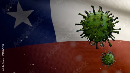 3D illustration flu coronavirus float over Chilean flag. Chile pandemic Covid 19