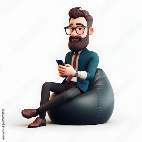 3D illustration of a bearded man wearing glasses and casual clothing, sitting on a blue bean bag and using a smartphone, with a solid orange background. Ideal for themes of relaxation, technology, and