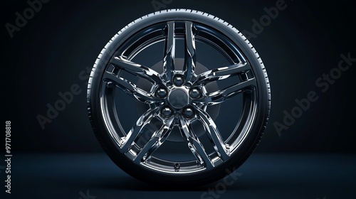 3D illustration of a car wheel with a brake system isolated against a dark background