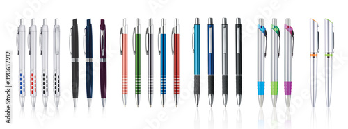 3D illustration of a collection different ball pens in plastic and metal material in mix colors and shapes on white background in vertical composition